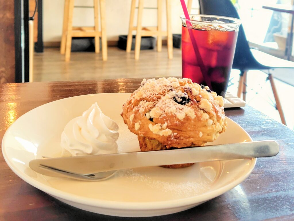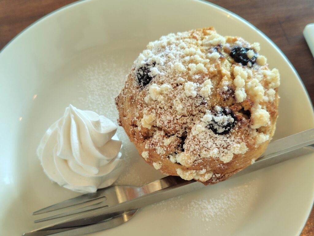 アメリカンスタイルの大きなマフィン。甘さ控えめなホイックリームが添えられていました。