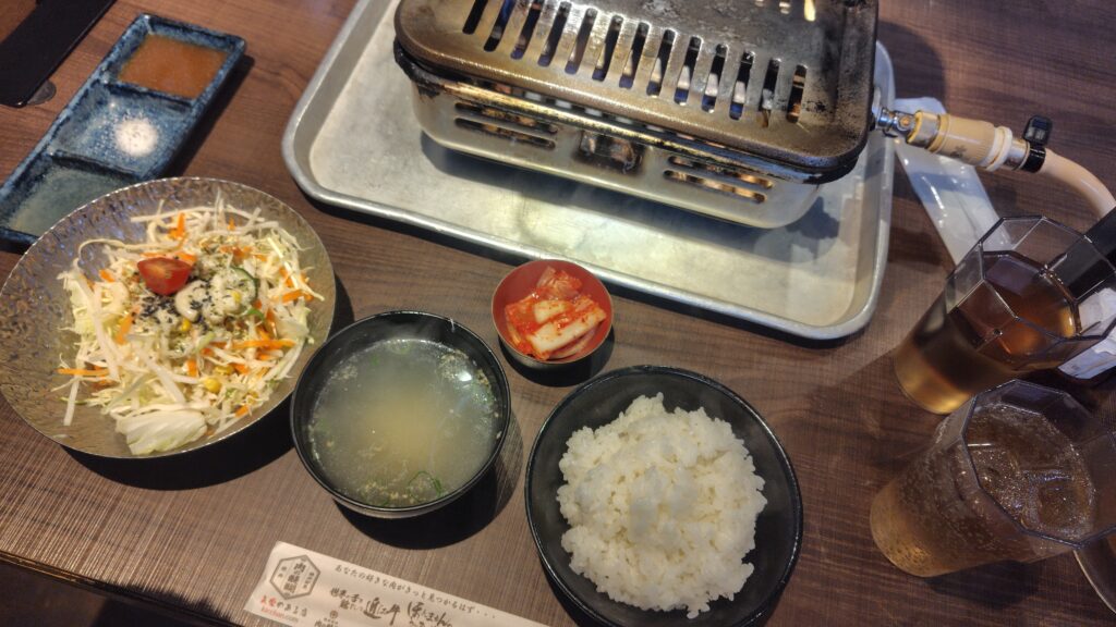 特選カルビ・特上ハラミ・特上ロースが各50、焼き野菜・サラダ・ご飯・スープ・アイスがセットに。