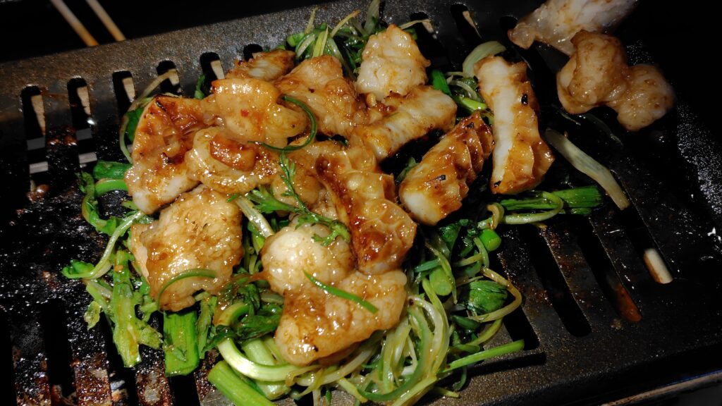 朝挽きされた新鮮なホルモンを使用した無限焼き。お肉にしっかり味がついていて、コリコリした歯ごたえでご飯が進む一品。一緒に焼く野菜が程よい箸休めに。